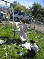Below: kids letting the sleet slide down the slide in balls and clumps.