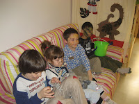 We had a few rounds, initially easy like dog, elephant, then harder, like rhino and giraffe (not much sound to make). This shows the kids sitting together playing charades. That's S, who will be returning to Australia for his new school term (cos he starts Primary 1 in Feb) this week, so it was good that ds1 had this chance to play with him just before he leaves.